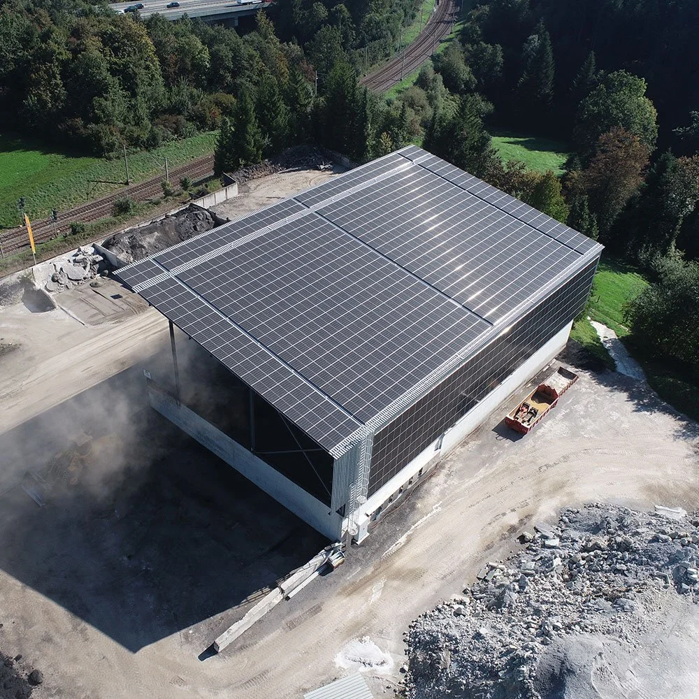 Die Belag und Beton AG hat hier die Gegebenheiten optimal für eine Photovoltaikanlage ausgenutzt. Auf dem Kiessilo ist eine Schrägdachanlage und auf der Schüttguthalde eine Dach- und Fassadenanlage realisiert worden. Insgesamt wurden 989 PV-Module verbaut.